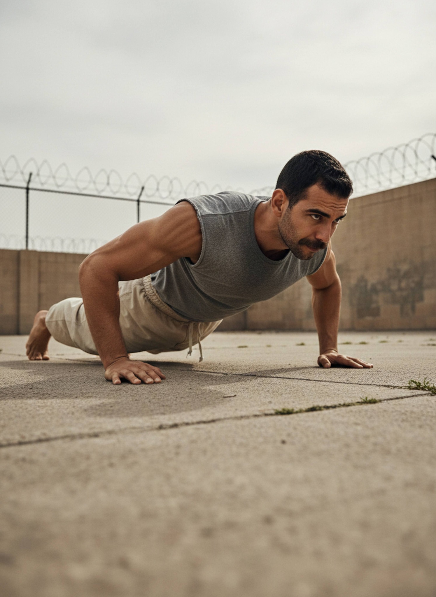 Forge iron discipline with this Baki prison pushups portrait effect. Your photo is transformed into a scene inside a training yard performing controlled knuckle push-ups on cracked concrete. A sleeveless prison-issued gray athletic shirt and faded beige training pants with rough fabric texture capture the raw prison arc aesthetic. Barefoot on concrete, every muscle strains with purpose. The harsh daylight and institutional surroundings amplify the discipline. Ideal for Baki fans, fitness enthusiasts, and anime martial arts portrait lovers.