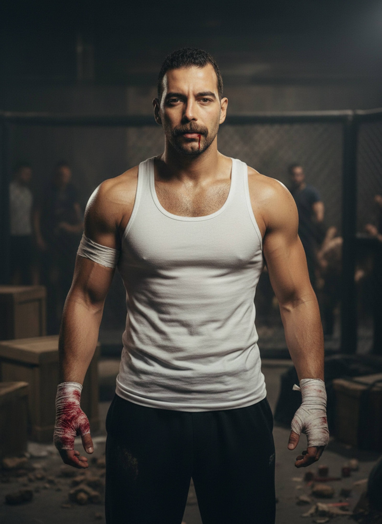 Stand victorious with this Baki underground match portrait effect. Your photo is transformed into the aftermath of a brutal underground fight wearing a white sleeveless tank torn at the shoulder. Hands loosely wrapped with blood-stained gauze tell the story of battle. Shoulders heavy but upright, the pose conveys exhausted triumph. Black fight pants and the dim underground arena lighting create a raw, authentic combat atmosphere. Ideal for Baki fans, combat sport enthusiasts, and anime portrait creators.