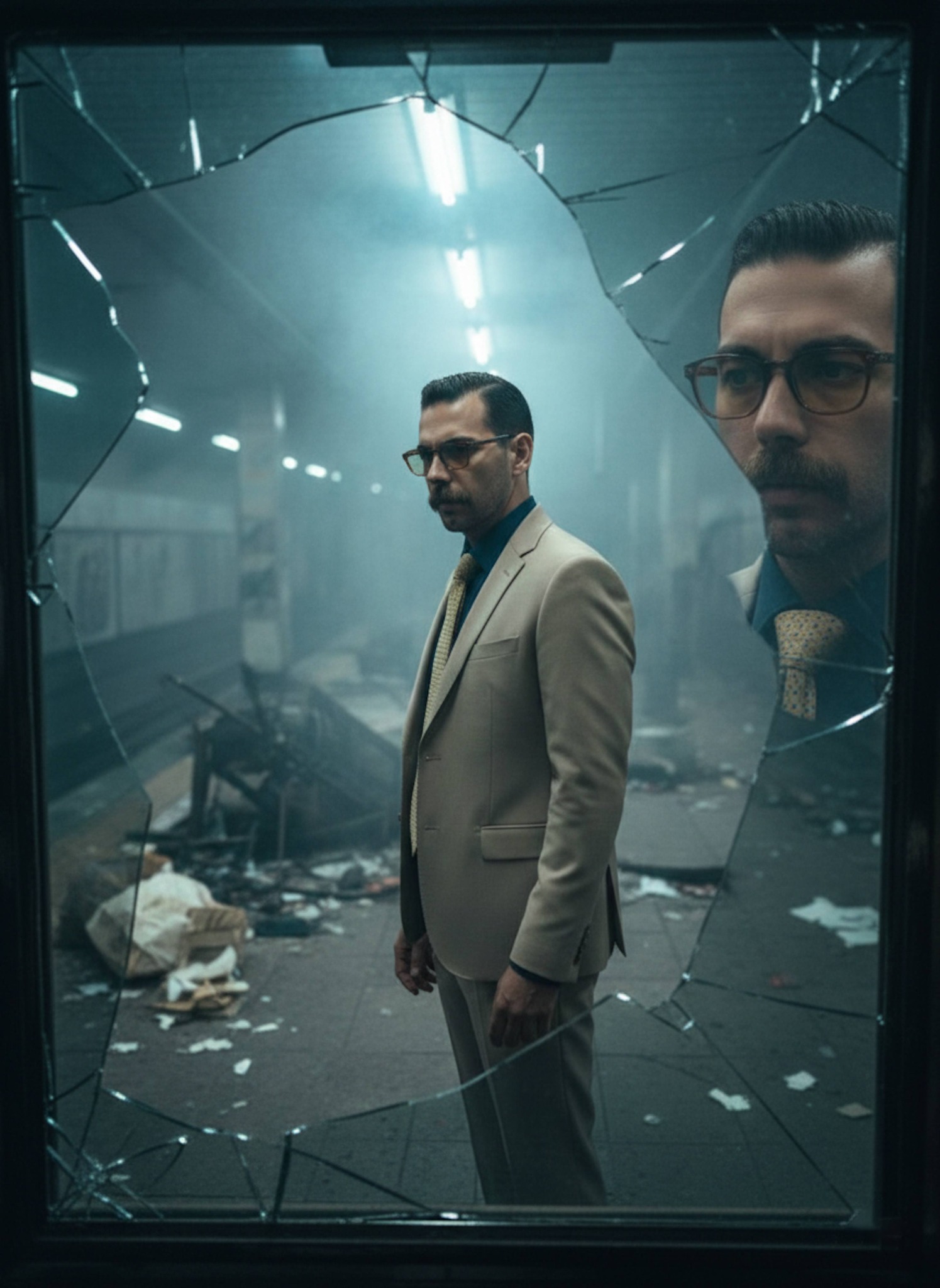 Be framed through a shattered window with jagged glass shards creating a natural vignette around your Nanami portrait. The broken glass foreground adds artistic depth while your figure stands in a devastated Shibuya backdrop. Light refracts through glass fragments creating prismatic accents across the composition. Perfect for anime art collectors wanting a uniquely composed JJK portrait with cinematic framing.