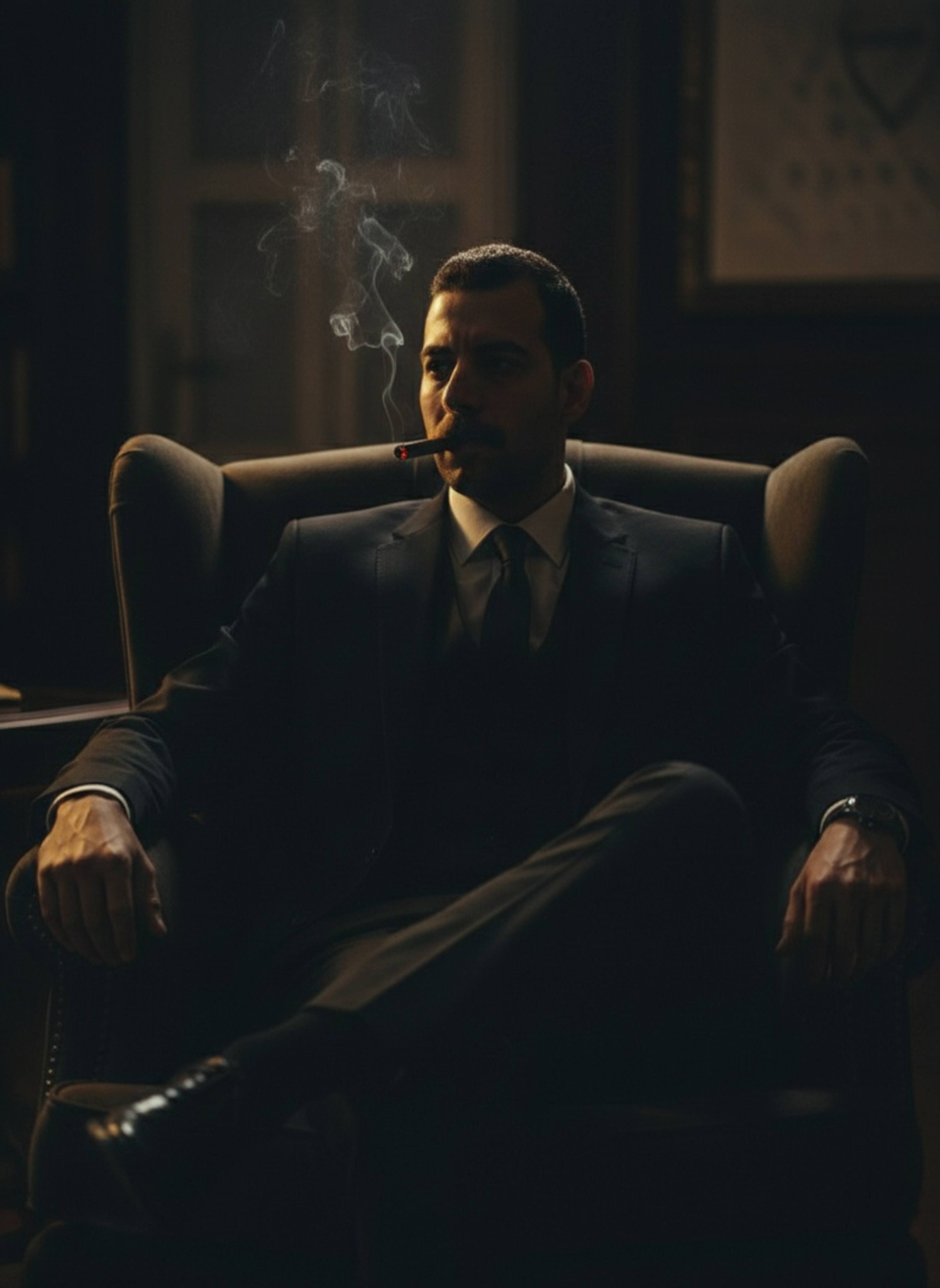 Sit as a silhouette in a heavily backlit office with only rim light revealing your partial profile as subtle cigar smoke curls upward. This cinematic effect channels invisible but felt menace through extreme backlighting. Perfect for fans of shadowy, powerful authority character portraits.