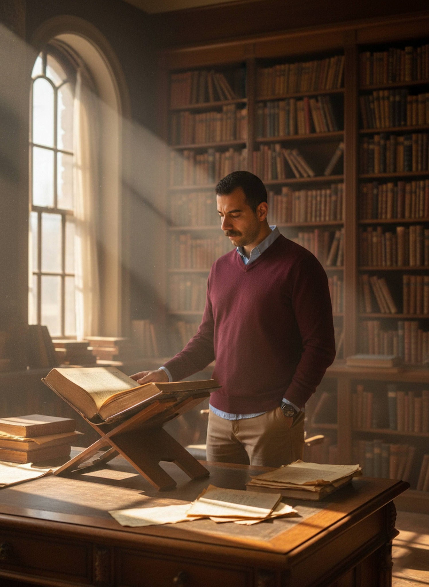 Stand in a dusty sunlit library as strong beams of window light slice through the room revealing floating dust motes. Wearing a deep burgundy V-neck wool sweater over a light blue collared shirt, this 35mm environmental portrait captures the search for knowledge. Ideal for book lovers and academic portrait fans.
