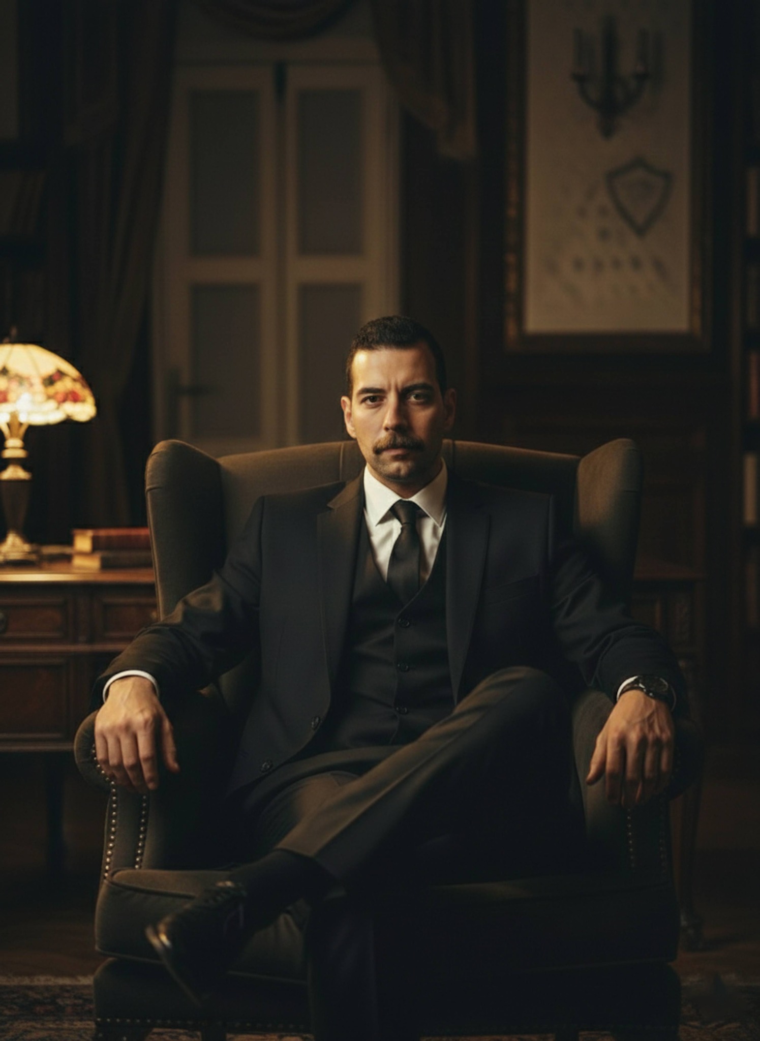 Sit and look directly into the lens as the face of the Don in a classic mafia-style interior with perfect chiaroscuro lighting. This final cinematic portrait delivers the most accurate identity representation with silent, absolute authority. Ideal for fans of definitive mafia boss character portraits.