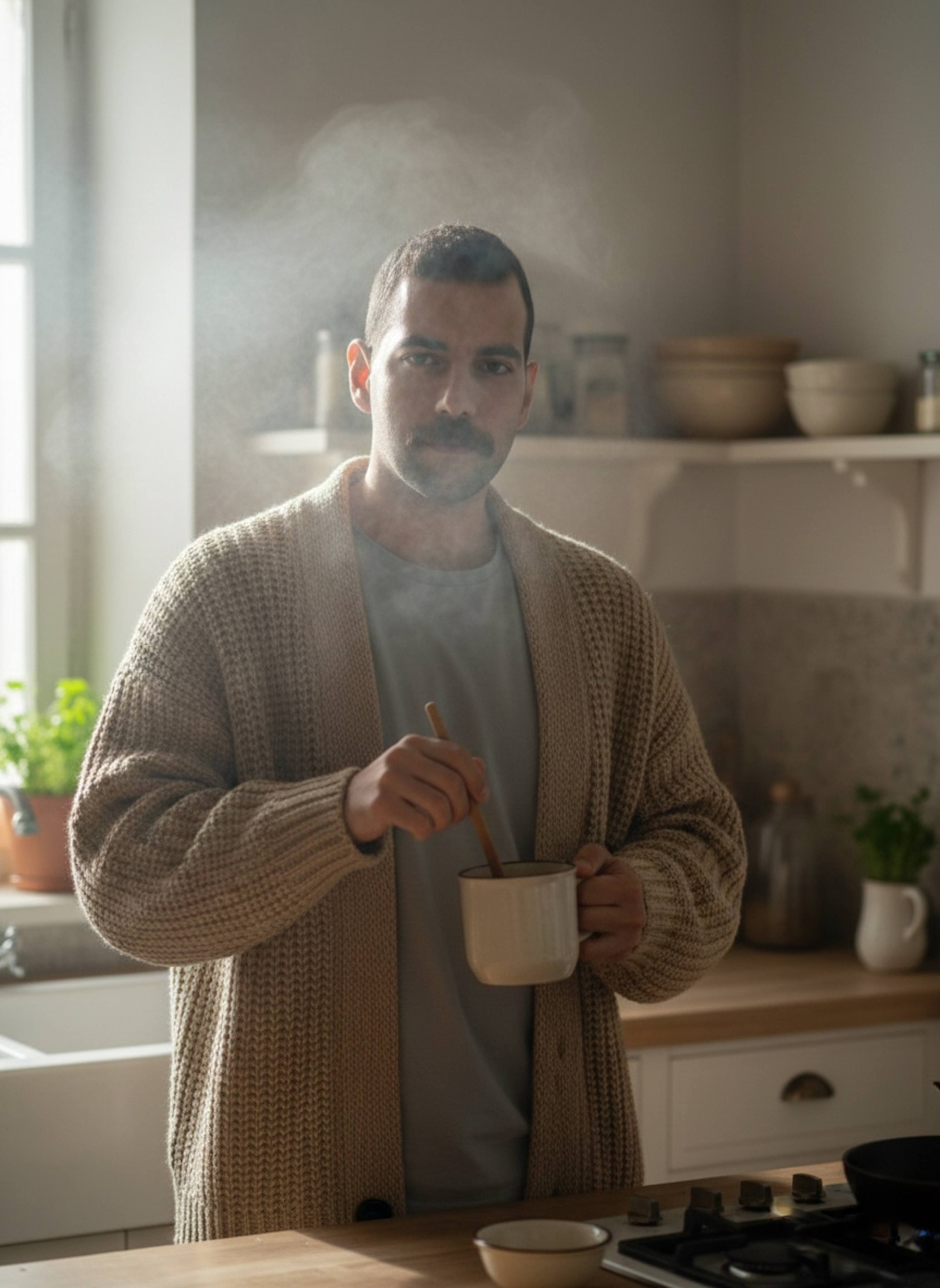 Find comfort in a rustic kitchen filled with morning steam as soft window side-light illuminates the vapor around you. Wearing an oversized chunky beige knitted cardigan over a simple grey tee, this 50mm medium close-up captures domestic warmth. Perfect for fans of cozy, inviting lifestyle portraits.