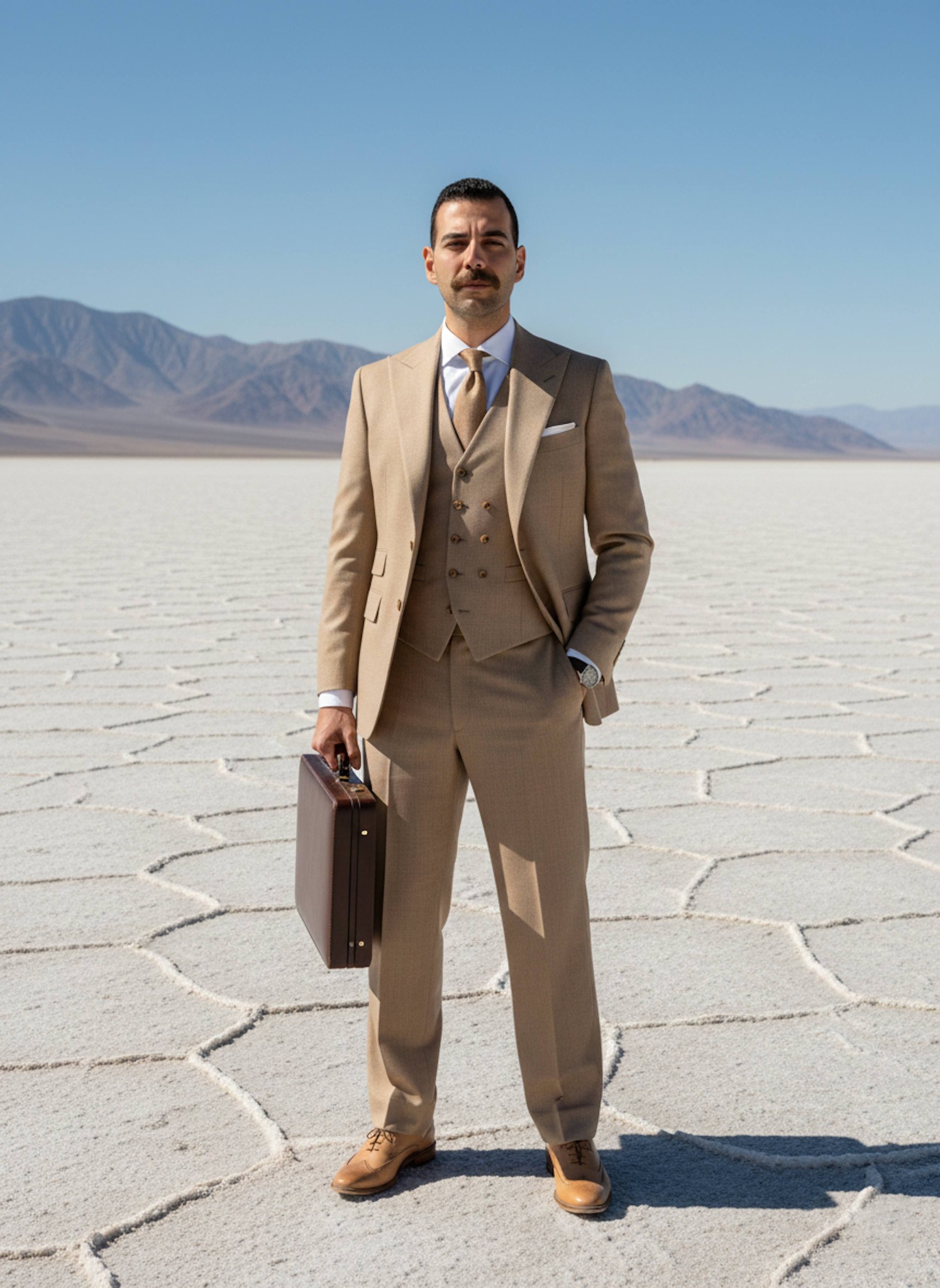 Command a vast dry salt flat with distant mountains as a real estate mogul in a bespoke sand-colored three-piece suit with six-button waistcoat. This ultra-wide environmental portrait captures power and isolation in endless desert terrain. Perfect for fans of expansive, cinematic business portraits.