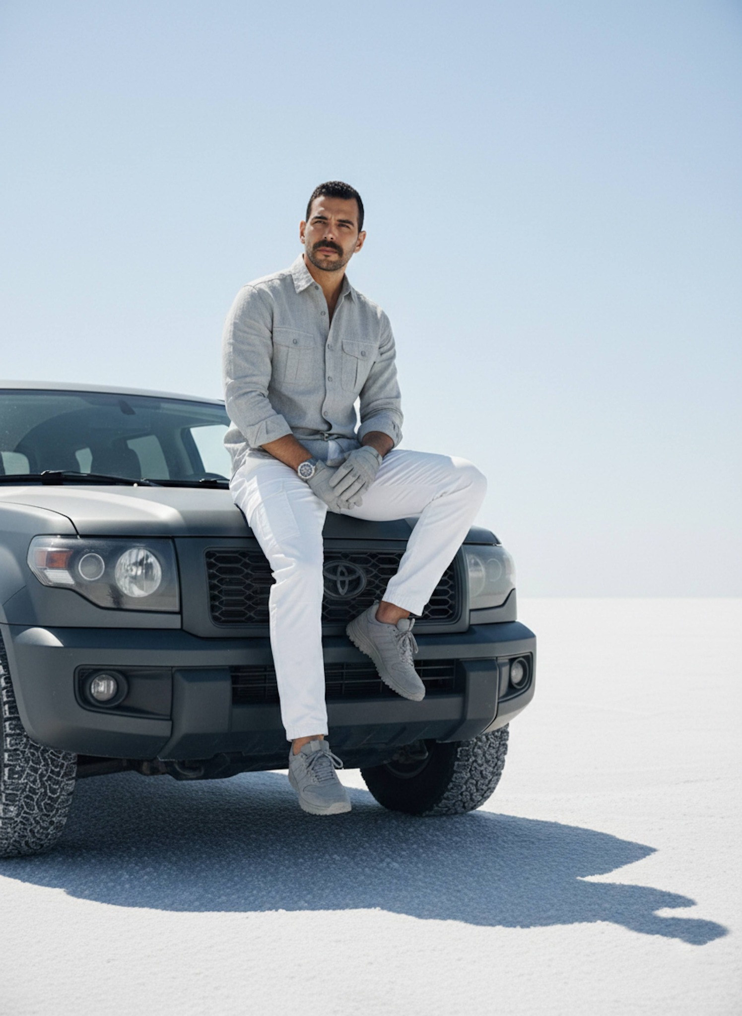 Plan the next move with this salt flat tactical SUV portrait effect. Your photo is placed sitting on the hood of a matte-painted tactical SUV in the middle of a vast salt flat. A light gray linen-blend tactical shirt and white high-density gear create a clean operator aesthetic against the infinite white ground. The perfect flat horizon where white meets pale blue sky delivers surreal minimalist scale. The vehicle and figure are the only elements in the vast emptiness. Ideal for automotive fans, tactical enthusiasts, and cinematic landscape portrait lovers.