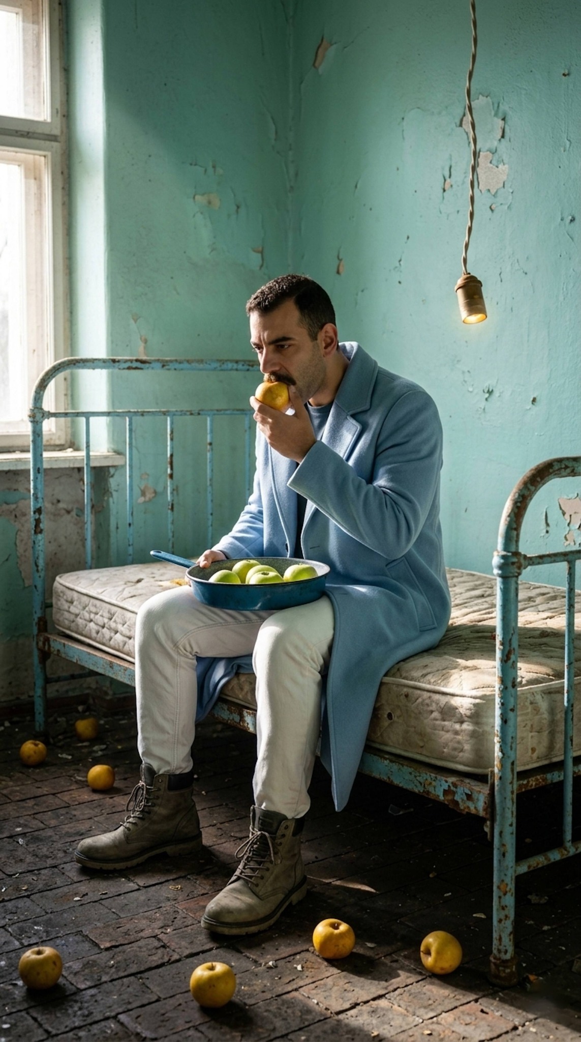 Sit on the edge of an old metal bed frame painted sky blue in a surreal room wearing a long baby blue wool coat with white beach-washed denim and industrial boots. Your hyper-realistic 8K portrait captures emotional stillness in a dreamlike environment with peeling paint and weathered textures. The monochromatic blue palette and raw setting create a hauntingly beautiful atmosphere of quiet despair. Built for cinematic art fans, surreal portrait lovers, or anyone wanting an emotionally powerful portrait.