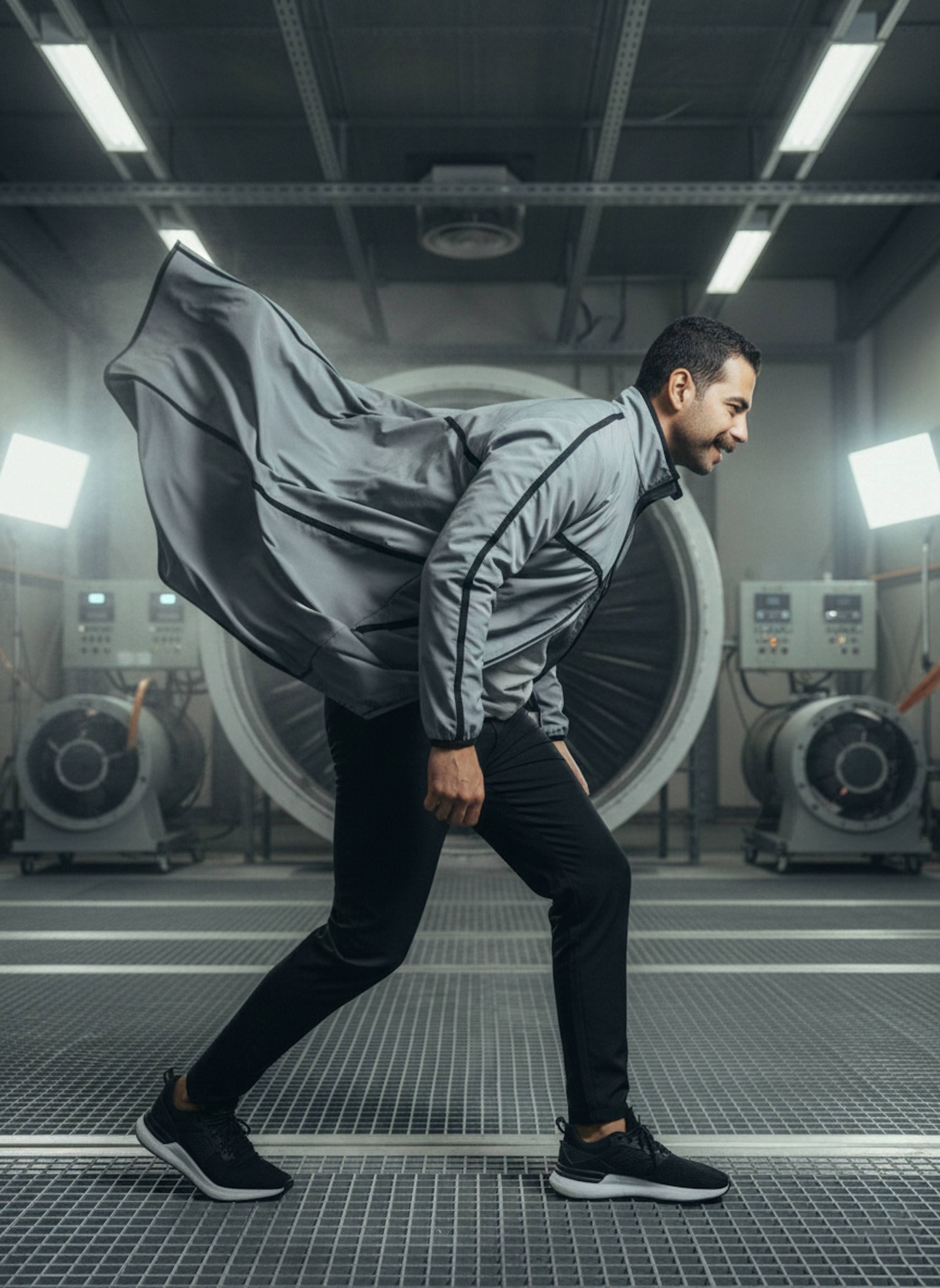 Feel the force with this wind tunnel portrait effect. Your photo is placed inside an industrial wind tunnel facility with powerful air blasting your clothes into dynamic motion. A lightweight gray technical jacket with elastic seams and black athletic pants ripple in the airflow. The raw aerodynamic energy and clinical tunnel environment create a unique high-speed composition. Perfect for motorsport fans, aviation enthusiasts, and anyone wanting a portrait bursting with kinetic energy.