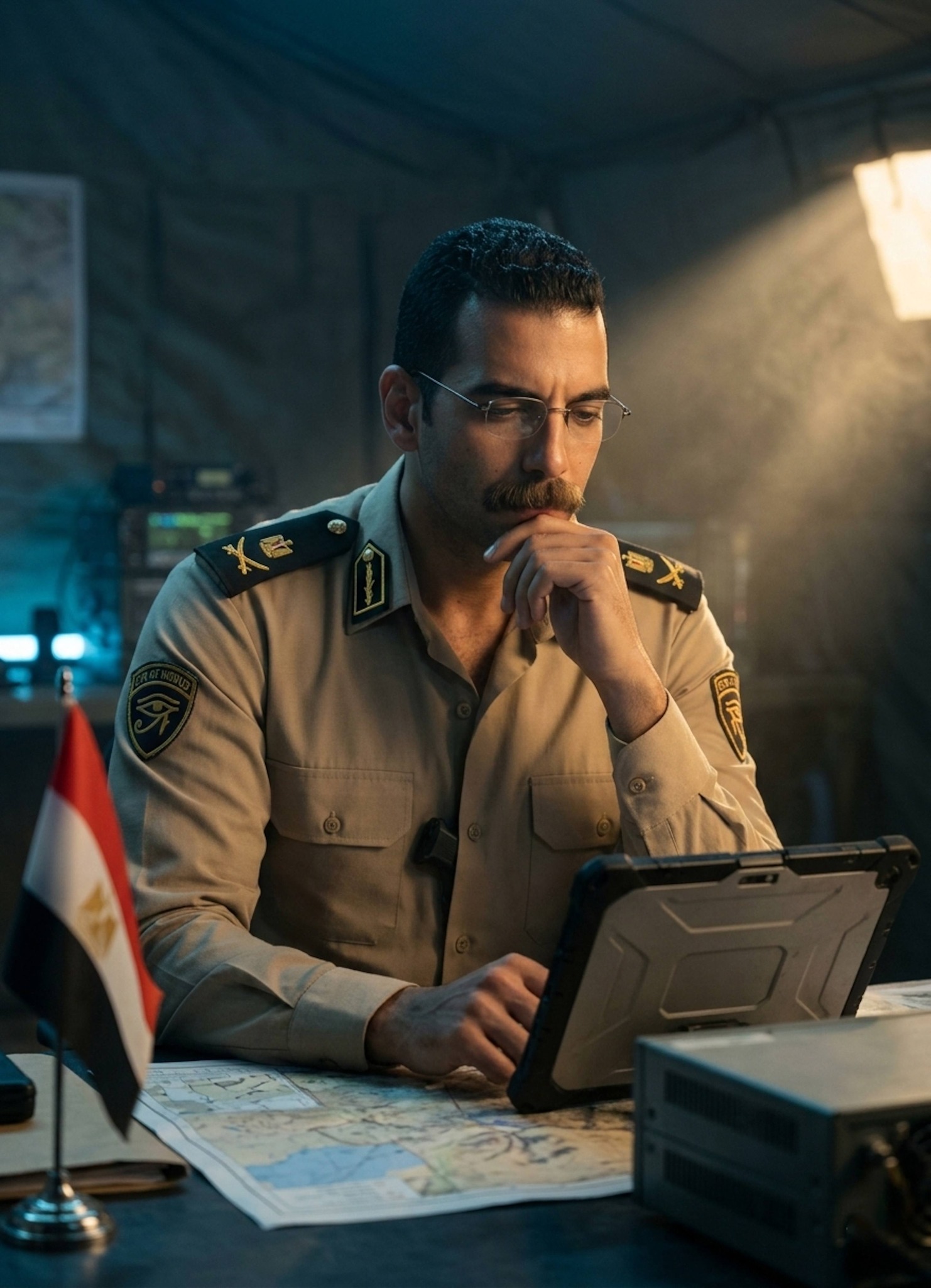 A strategic portrait captures you sitting in a field tent in a tan service shirt with Eye of Horus intelligence crest on shoulder patches, studying encrypted maps on a tablet. Spectacles and a concealed sidearm bulge add layers of intellectual combat authority. Ideal for intelligence fans, strategic military aesthetics, and those seeking portraits of analytical desert command.