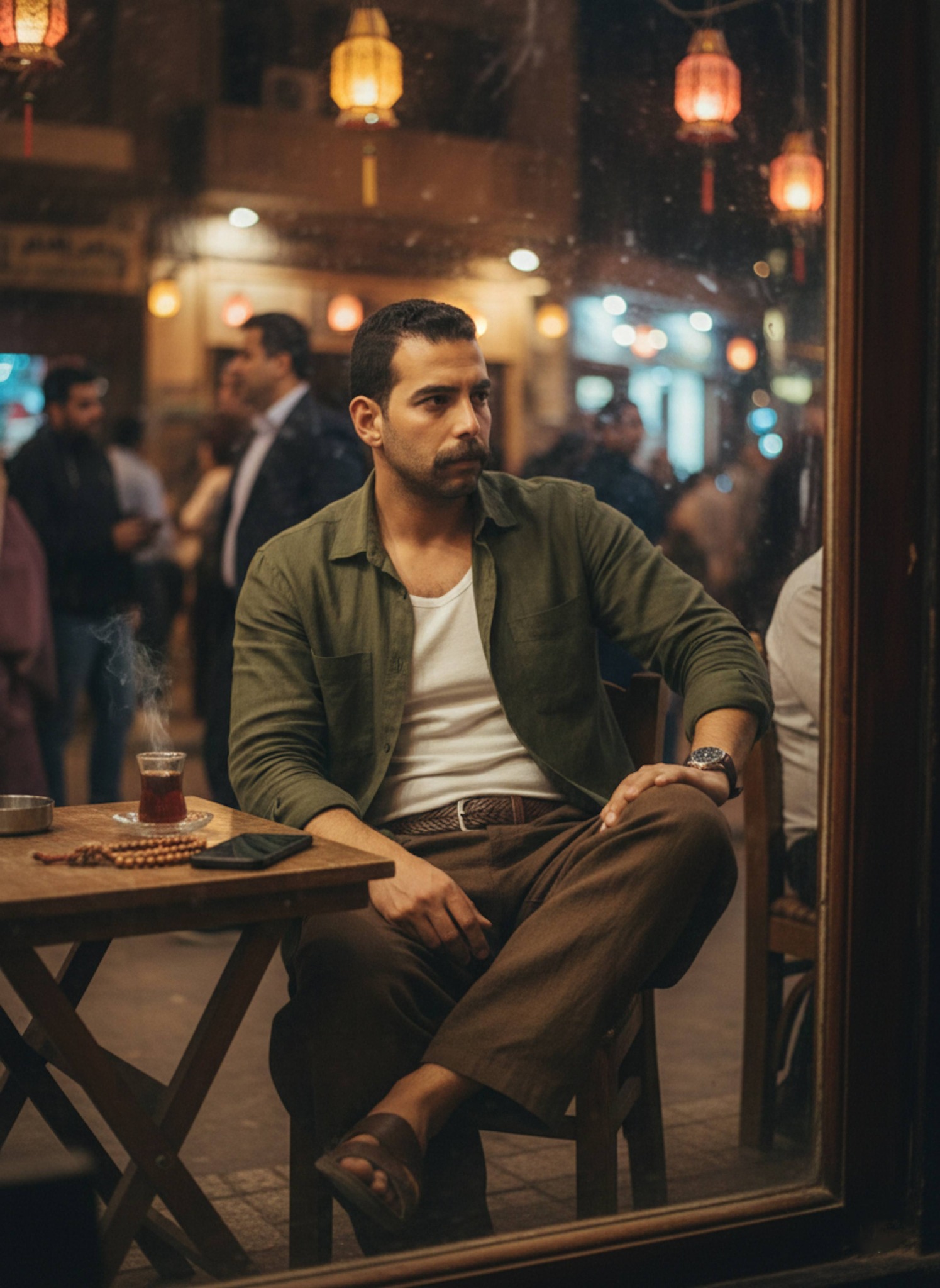 A reflection shot through a cafe window captures you scanning the environment with stoic endurance at a traditional Sayeda Zeinab cafe during a Ramadan night. The double-layered image of reflection and interior creates complex visual intrigue and covert tension. Ideal for spy thriller fans, Ramadan atmospherics, and those seeking layered, mysterious portraits.