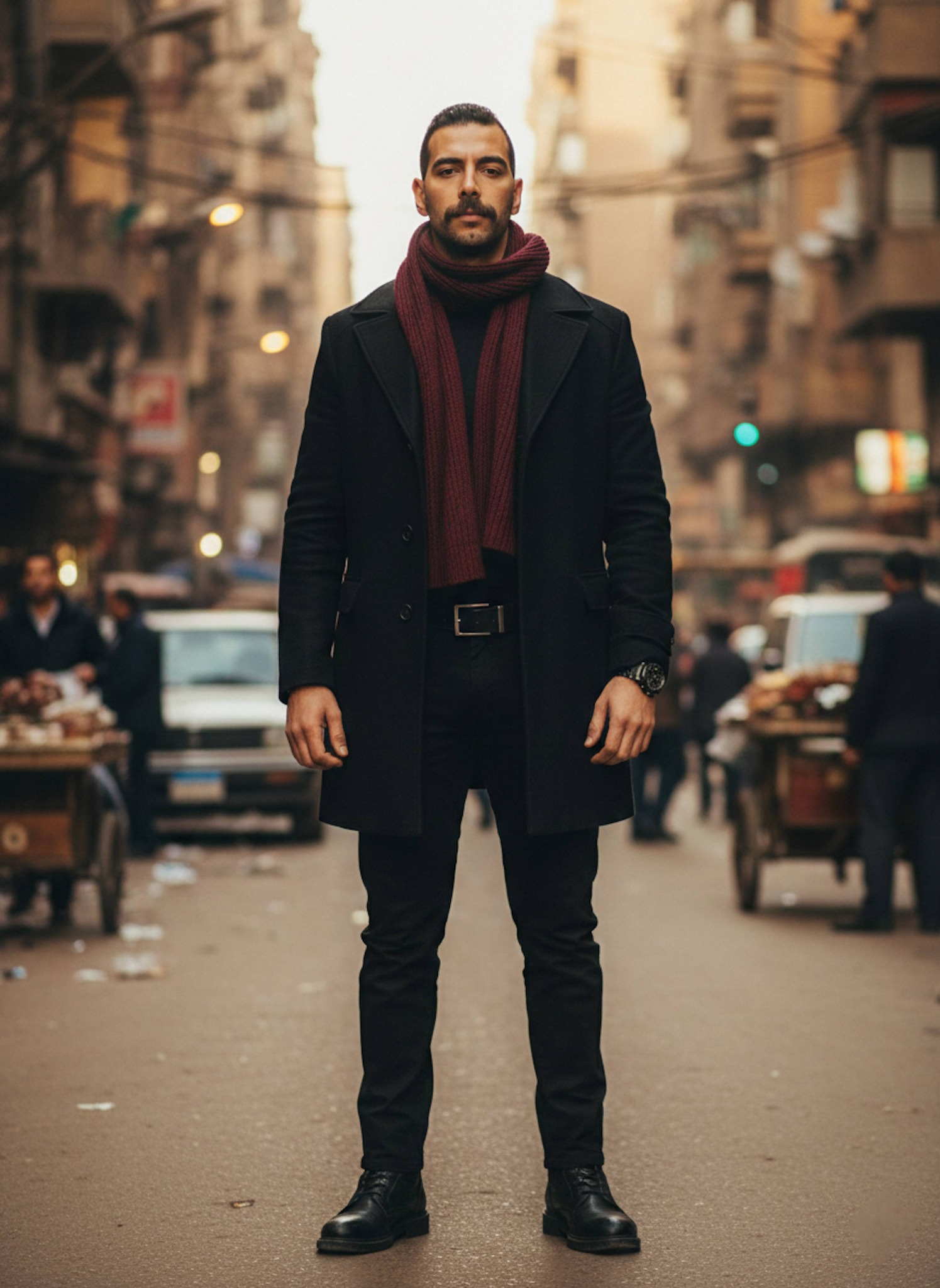 A wide establishing shot pulled tight captures you leaning against a post with arms folded on the bustling Nile River commercial docks in Aswan. Stoic watchfulness defines your posture against the backdrop of river commerce and golden light. Perfect for thriller fans, Nile River lovers, and anyone seeking a portrait of quiet, commanding presence.