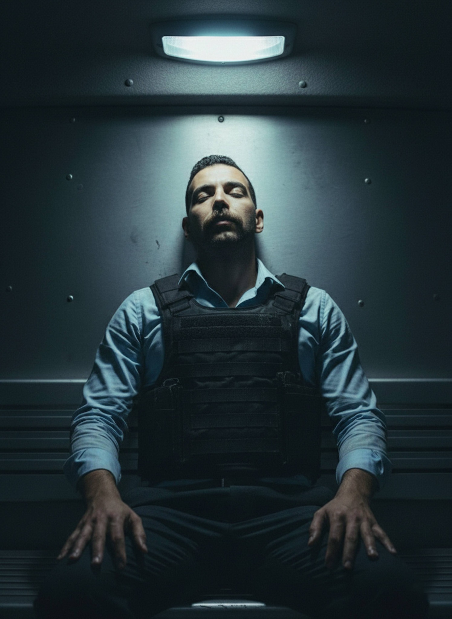Process the aftermath with this police transport van portrait effect. Your selfie is captured inside a dimly lit metallic police transport van in a vulnerable yet strong moment. A sweat-stained light blue button-down shirt with the collar open conveys the toll of a violent encounter. Cold metallic surfaces and harsh minimal lighting create a raw, intimate atmosphere. The confined space and emotional weight deliver powerful storytelling. Ideal for crime drama fans, detective fiction lovers, and cinematic portrait enthusiasts.