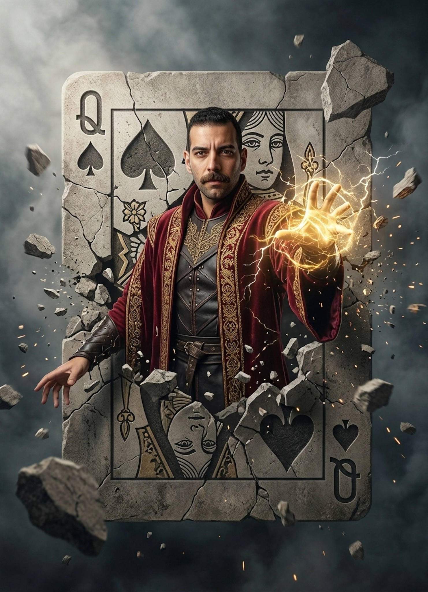 Shatter reality with this card sorcerer portrait effect. Your selfie is transformed into a powerful sorcerer emerging from a broken Queen of Spades playing card carved in stone. Rubble and debris explode outward as glowing golden magic energy forms in your outstretched hand with sparks and lightning swirling around your fingers. The epic dark fantasy composition and cinematic lighting deliver poster-worthy drama. Perfect for fantasy gamers, card game fans, and those wanting a truly epic portrait.