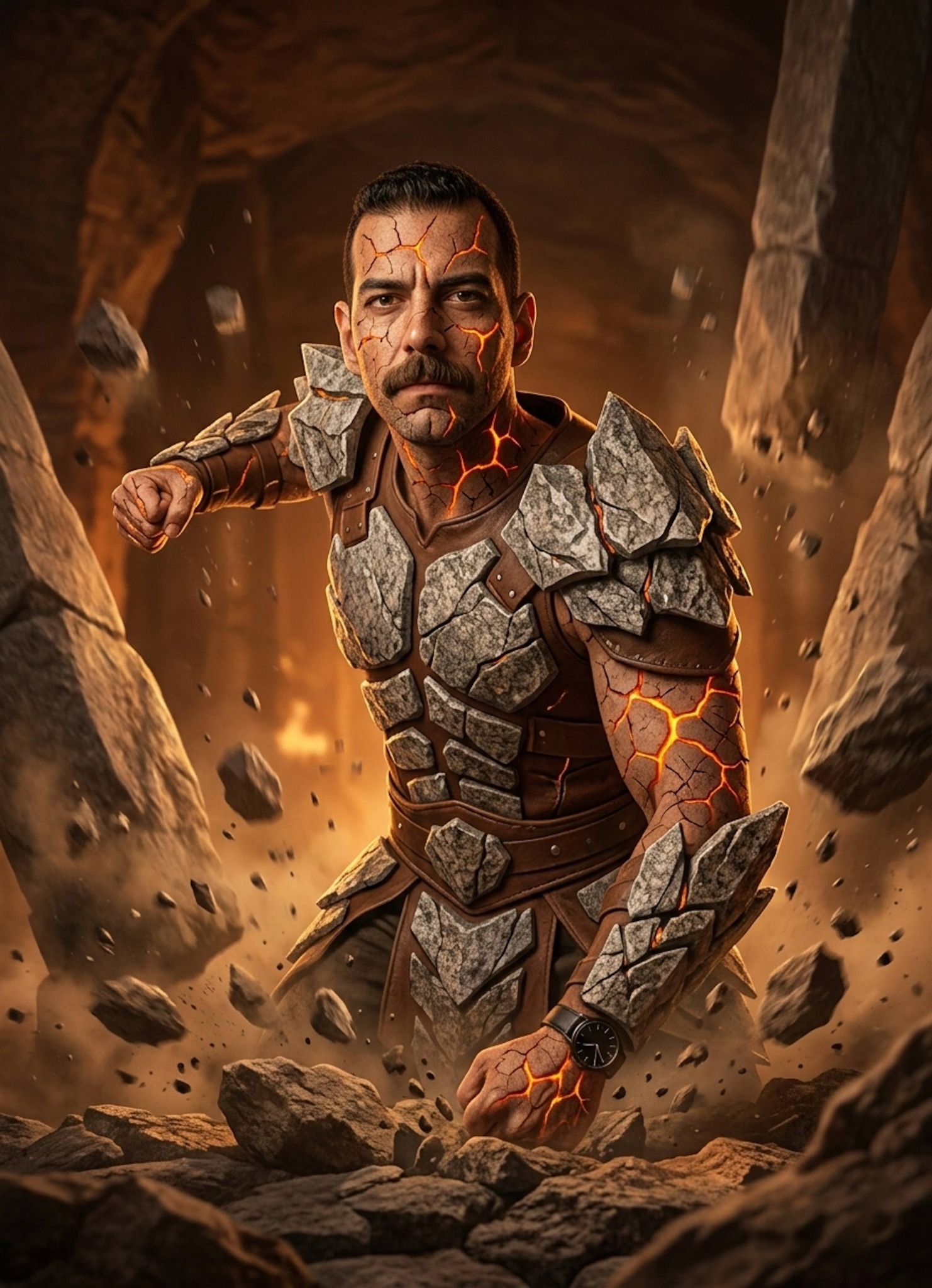 Punch the ground in a deep subterranean chamber wearing thick jagged granite plate armor fused to brown leather. Your portrait captures skin cracked like dry earth with glowing orange magma-like energy flowing through the fissures. Massive stone formations rise from the impact point as the chamber trembles. Built for earth-element fantasy fans, power fantasy enthusiasts, or anyone wanting a ground-shaking warrior portrait.