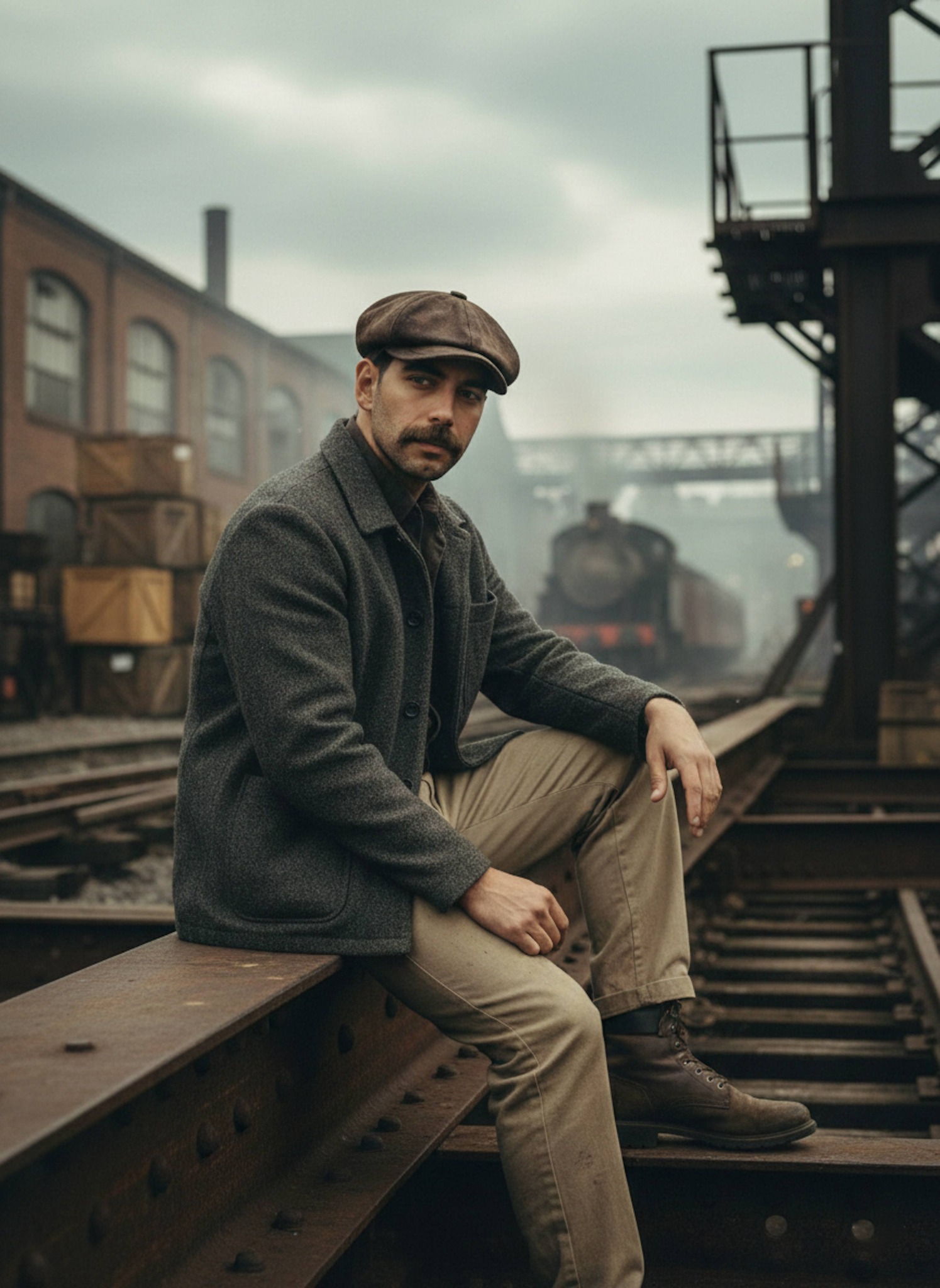 Sit among the iron and steel of a 1930s train yard in this gritty working-class portrait. You wear a leather newsboy cap, a wool work jacket, and heavy-duty chinos, perched on a steel beam surrounded by tracks and industrial machinery. The low-angle shot emphasizes raw toughness and Depression-era resilience. Perfect for vintage Americana fans, industrial aesthetics, or a rugged alternative to the typical profile photo.