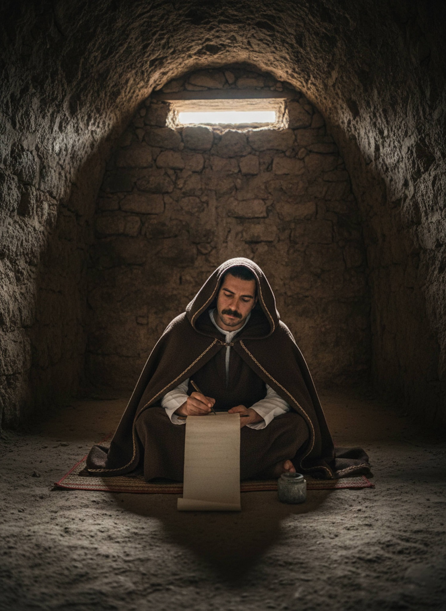 You sit on the steps of the Umayyad Mosque in Damascus writing the Muqaddimah as the great 14th-century historiographer Ibn Khaldun. The cinematic composition brings to life one of history's most influential scholars of sociology and philosophy. Ideal for history buffs and lovers of Islamic intellectual heritage.