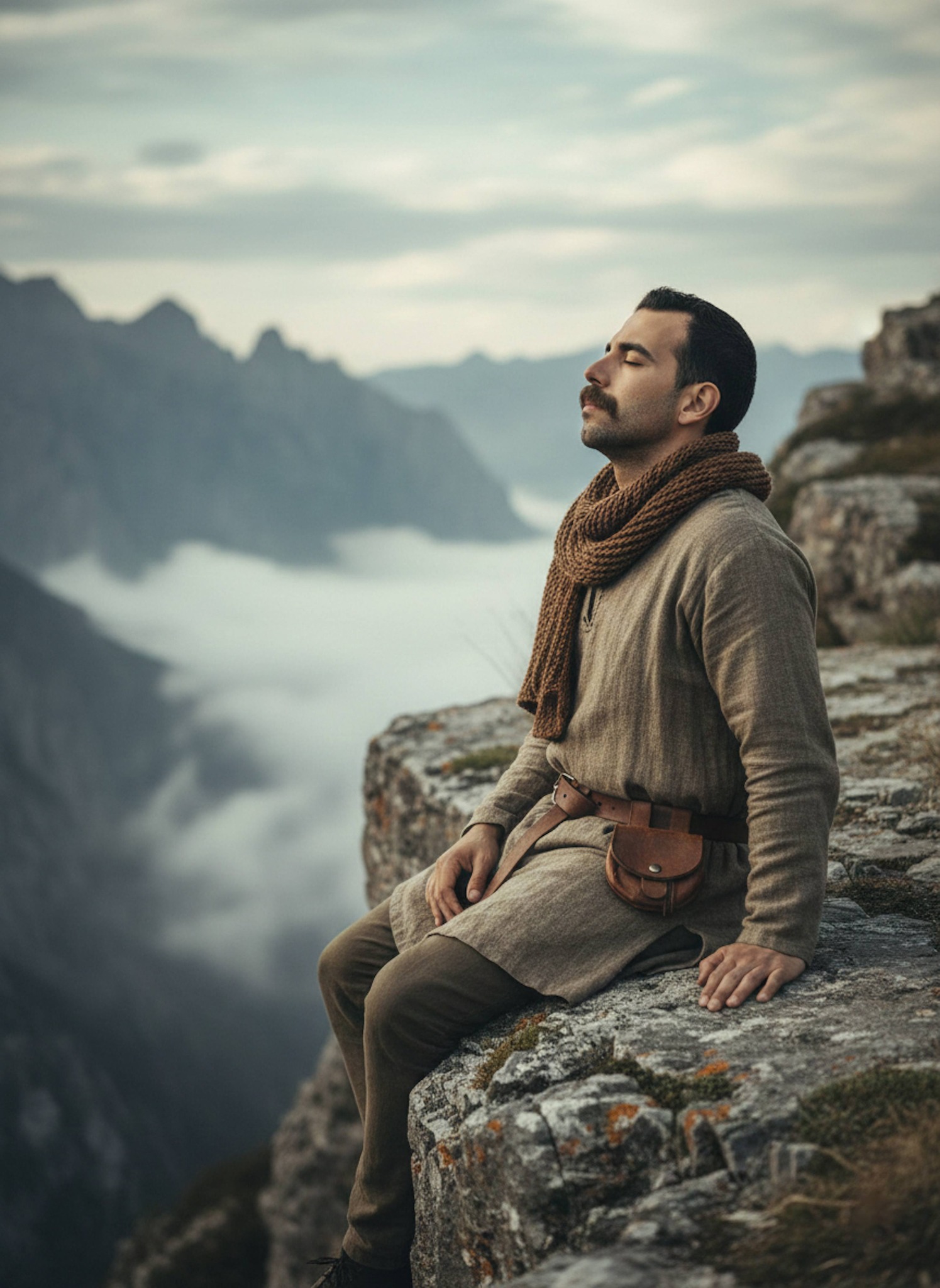 A tranquil portrait of you seated on a rocky cliff edge with eyes closed, feeling the mountain wind. Simple medieval linen clothing with a brown knitted scarf evokes timeless solitude against misty peaks and soft clouds. Perfect for history buffs, fantasy enthusiasts, and anyone seeking a contemplative mountain retreat aesthetic.