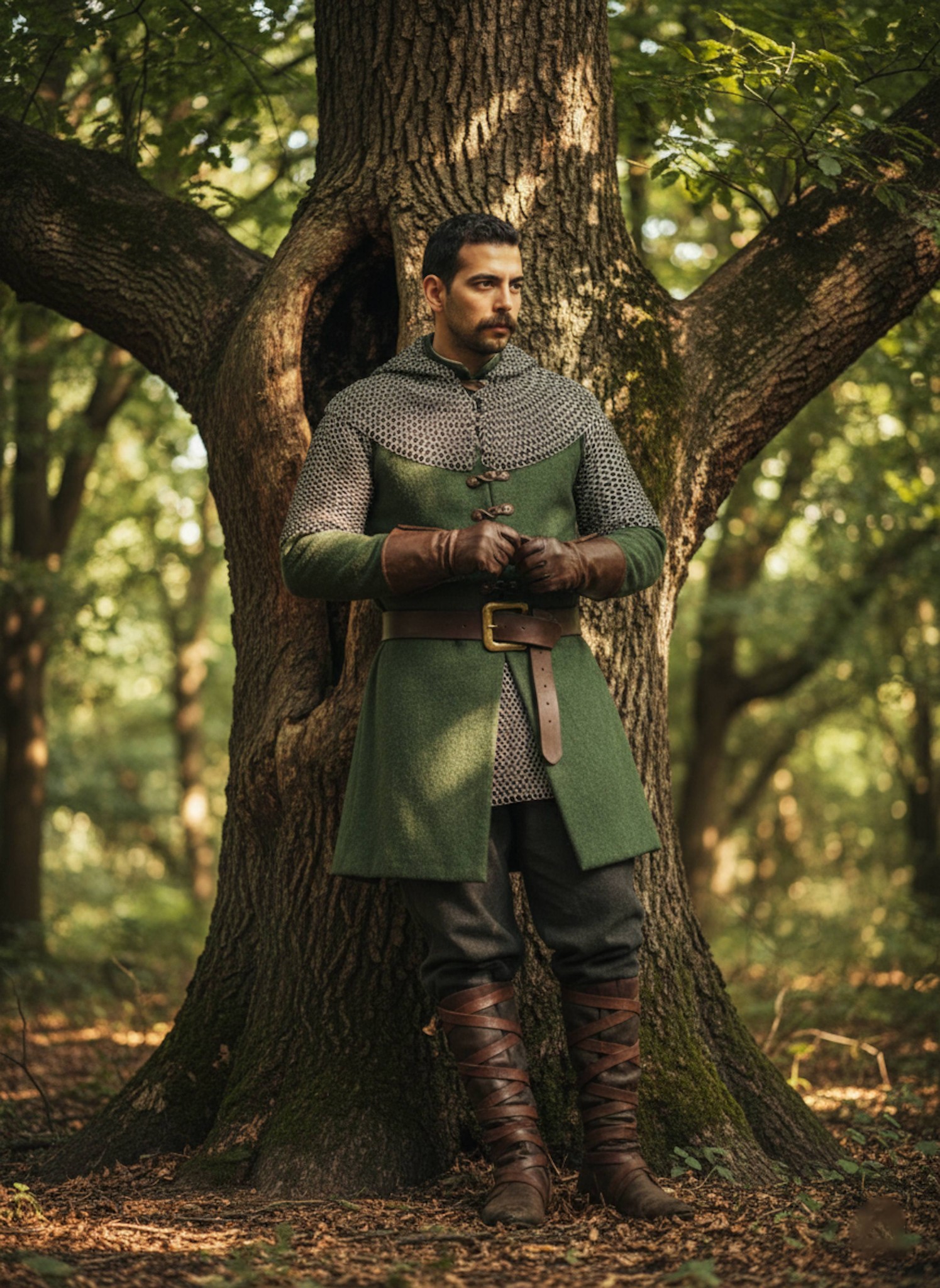 Patrol a medieval forest clearing in a forest-green boiled wool surcoat over a chainmail hauberk with individual interlocking steel rings, wide leather belt with brass buckle, and cross-wrapped leather boots. This historical effect delivers authentic medieval texture and woodland atmosphere. Ideal for medieval reenactment and fantasy portrait fans.