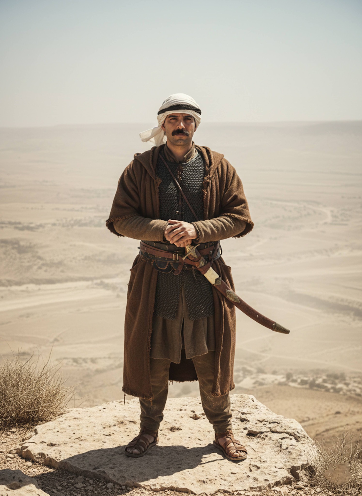 Survey the rugged terrain of the Yarmouk Valley from the edge of a limestone cliff as Khalid ibn al-Walid with wind whipping your cloak. Your portrait captures the legendary Sword of Allah strategizing for defense with period-accurate armor and commanding presence. Dramatic valley light and sweeping landscape views convey the weight of military genius. Ideal for Islamic history enthusiasts, military portrait fans, or anyone wanting a powerful medieval warrior portrait.