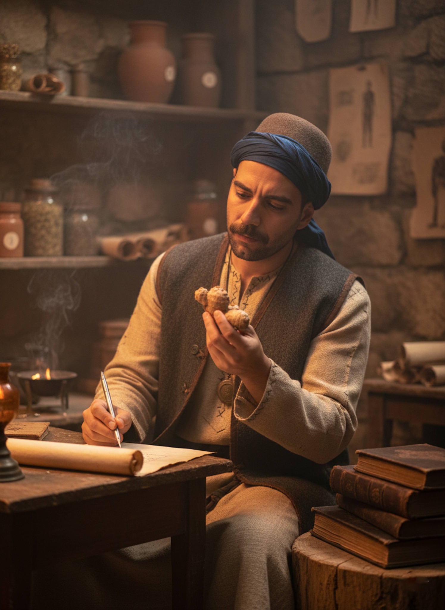 Write the Canon of Medicine by candlelight in Isfahan as Ibn Sina, the Father of Early Modern Medicine. Your portrait captures the 10th-century Persian polymath's focused scholarly concentration with period-accurate writing materials and medical texts. Warm flickering candlelight illuminates parchment and instruments against the dark study. Perfect for medical history fans, Islamic Golden Age enthusiasts, or anyone wanting a distinguished ancient physician portrait.