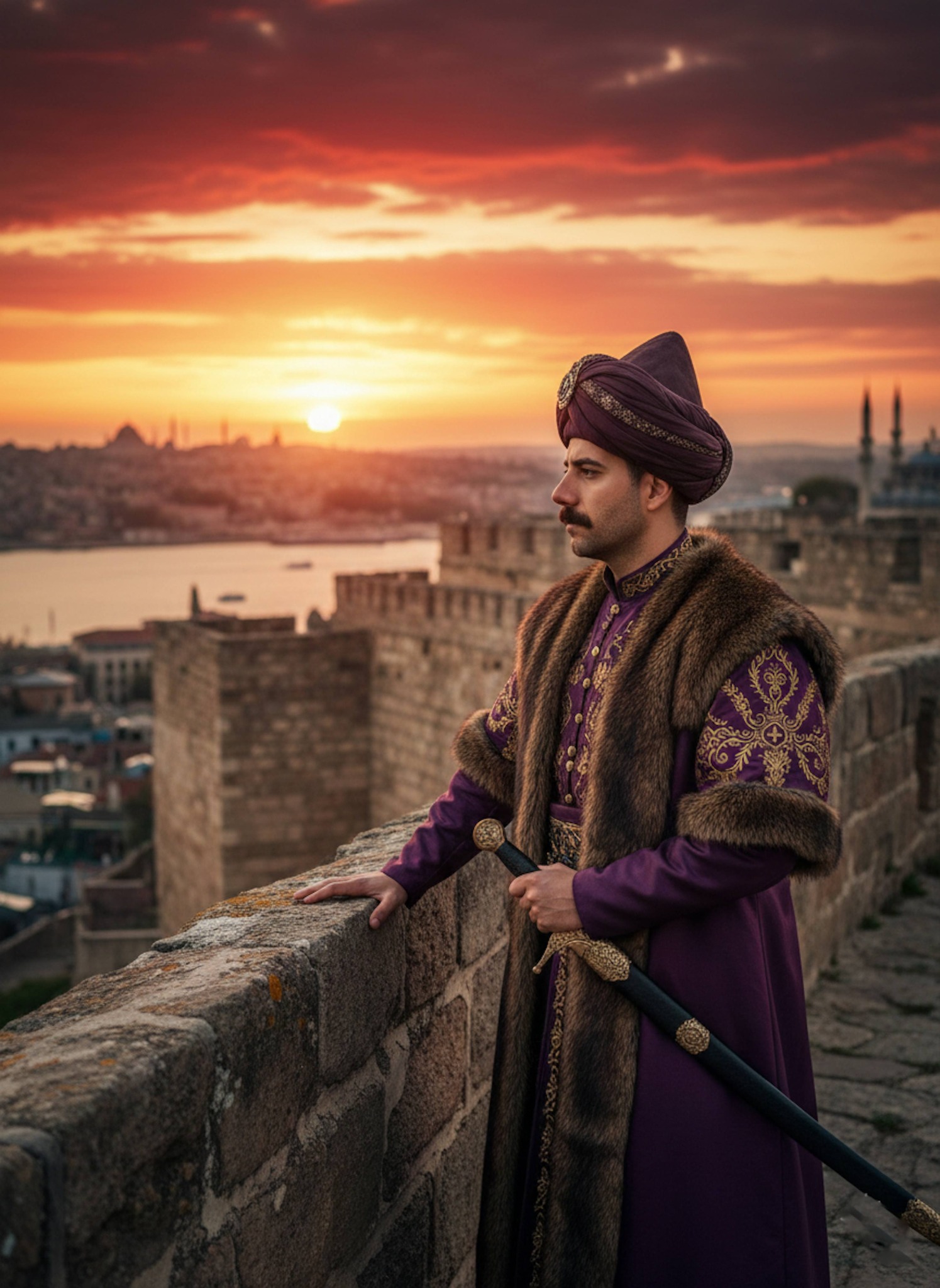 A commanding portrait of you standing on the walls of Constantinople, gazing over the Bosphorus in a moment of historic triumph. Ottoman-era armor and regal posture convey the grandeur of a 15th-century sultan's victory. Ideal for history buffs, Ottoman Empire enthusiasts, and those seeking a portrait radiating power and destiny.