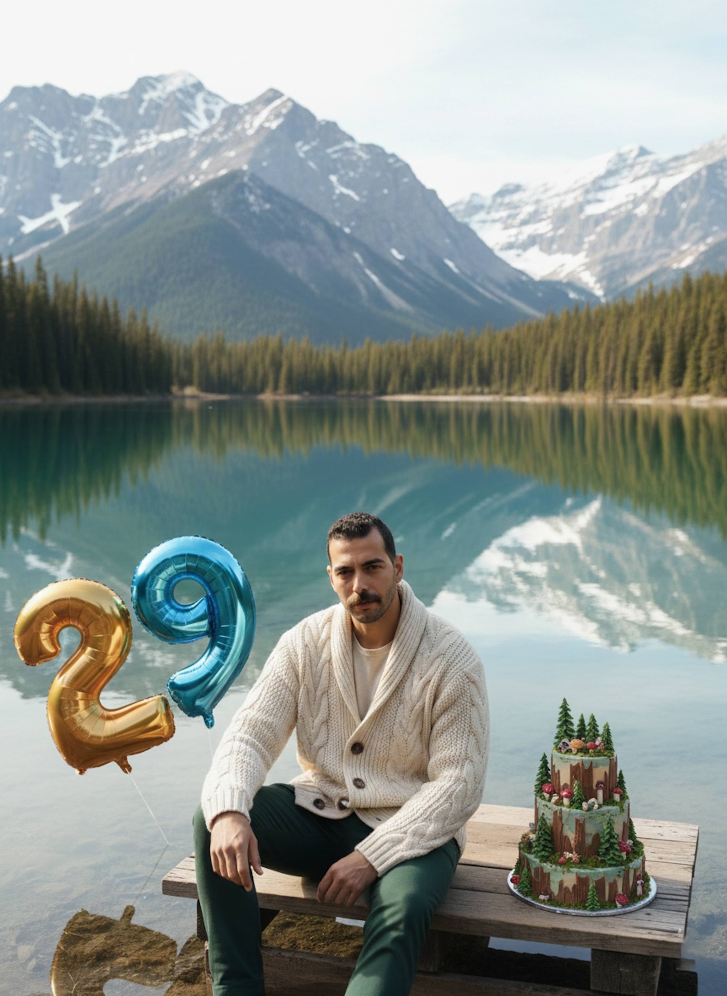 Find serenity at the lake with this mountain mirror reflection portrait effect. Your photo is transformed at a Canadian mirror lake with perfect mountain reflections in the still water. A heavy knit cardigan in cream and dark green trousers convey outdoor luxury amid pristine wilderness. A small wooden pier extends into the glass-like water creating depth and tranquility. The symmetrical reflection and soft natural light deliver a meditative, breathtaking composition. Perfect for nature lovers, outdoor fashion fans, and travel portrait enthusiasts.
