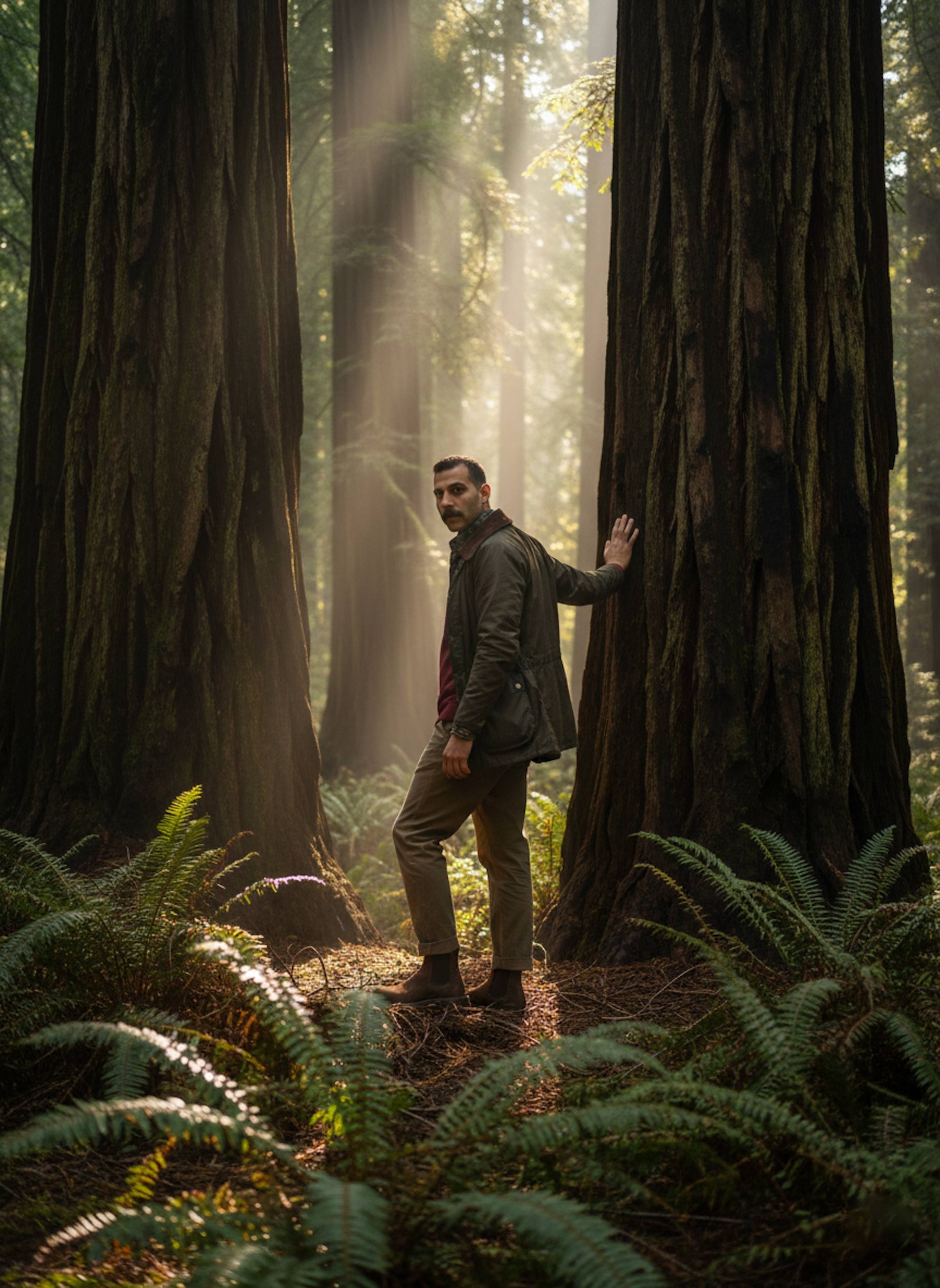 Stand among giants with this redwood forest portrait effect. Your selfie is placed between two massive ancient redwood trunks in Northern California. Dappled sunlight filters through the towering canopy creating shafts of light that illuminate rising mist on the forest floor. The immense scale of the ancient trees dwarfs the human figure creating a humbling, awe-inspiring composition. Warm natural tones and soft forest light deliver a meditative atmosphere. Perfect for nature lovers, California enthusiasts, and anyone wanting a majestic forest portrait.
