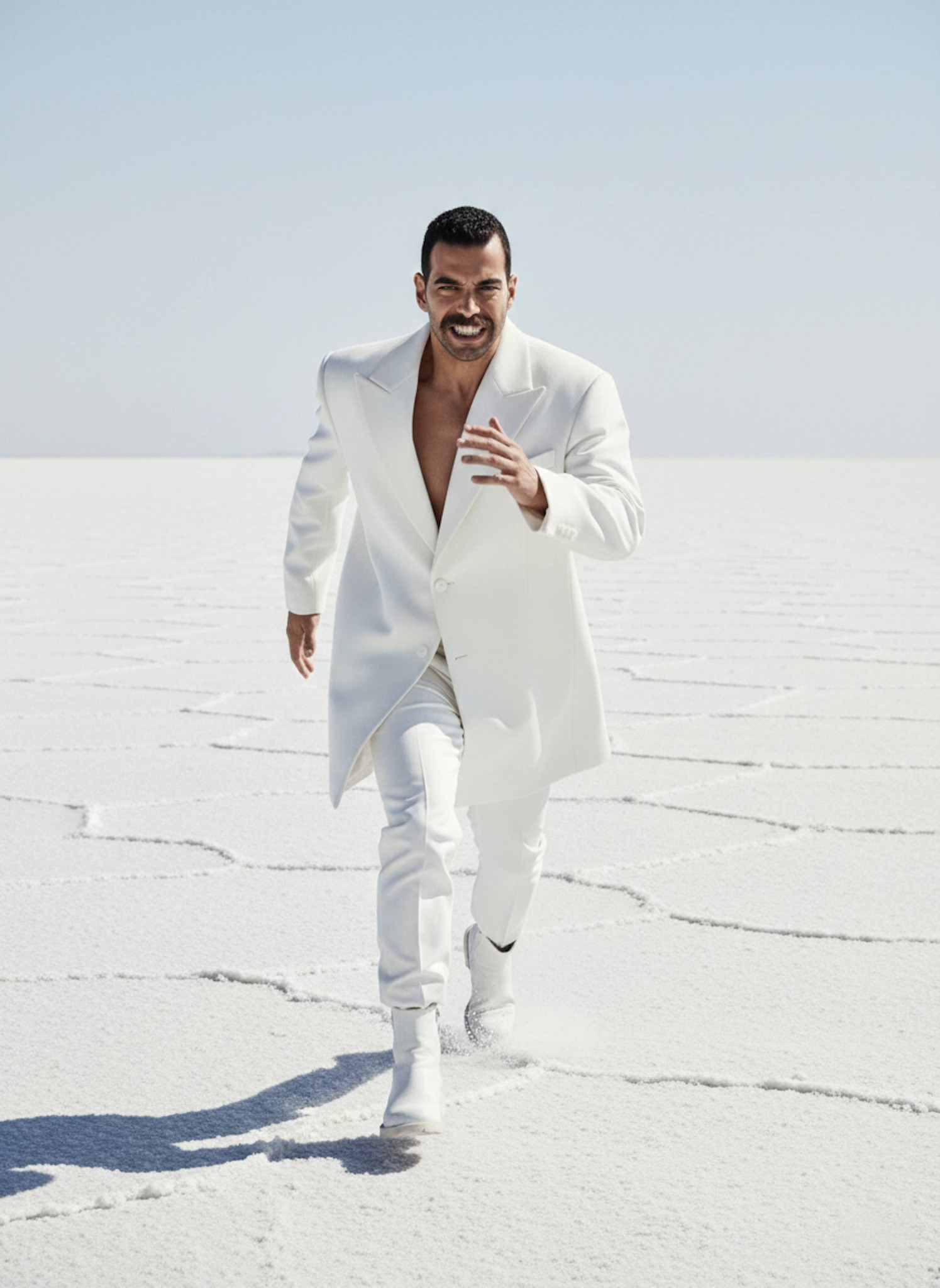 Vanish into white with this salt flat isolation portrait effect. Your photo is captured on a vast cracked salt flat wearing an all-white oversized coat with sharp tailoring, white trousers, and white leather boots. The infinite white horizon and cracked ground create a surreal minimalist landscape. The monochrome palette and endless negative space deliver a striking fashion-editorial composition. Ideal for minimalist fashion fans, surrealist art lovers, and high-fashion profile creators.