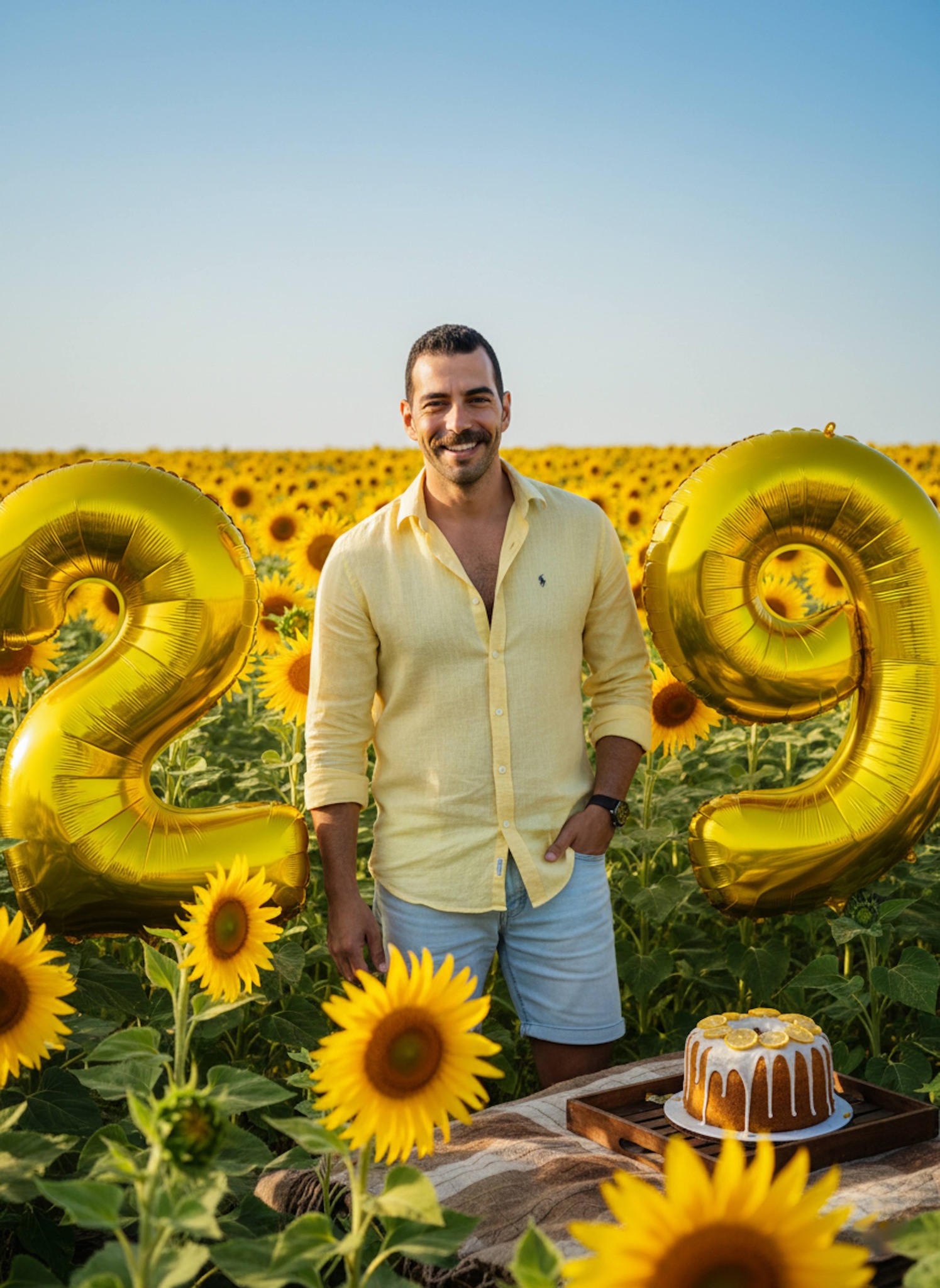 Bask in sunshine with this sunflower field portrait effect. Your selfie is surrounded by towering sunflowers in a Spanish field wearing a light yellow linen shirt and denim shorts. Vibrant yellow saturation and bright natural sunshine create an explosion of warmth and joy. The endless sunflower rows and blue sky backdrop deliver pure summer bliss. Every petal and linen fiber is rendered with photorealistic detail. Ideal for summer lovers, travel enthusiasts, and anyone wanting a portrait radiating pure happiness.