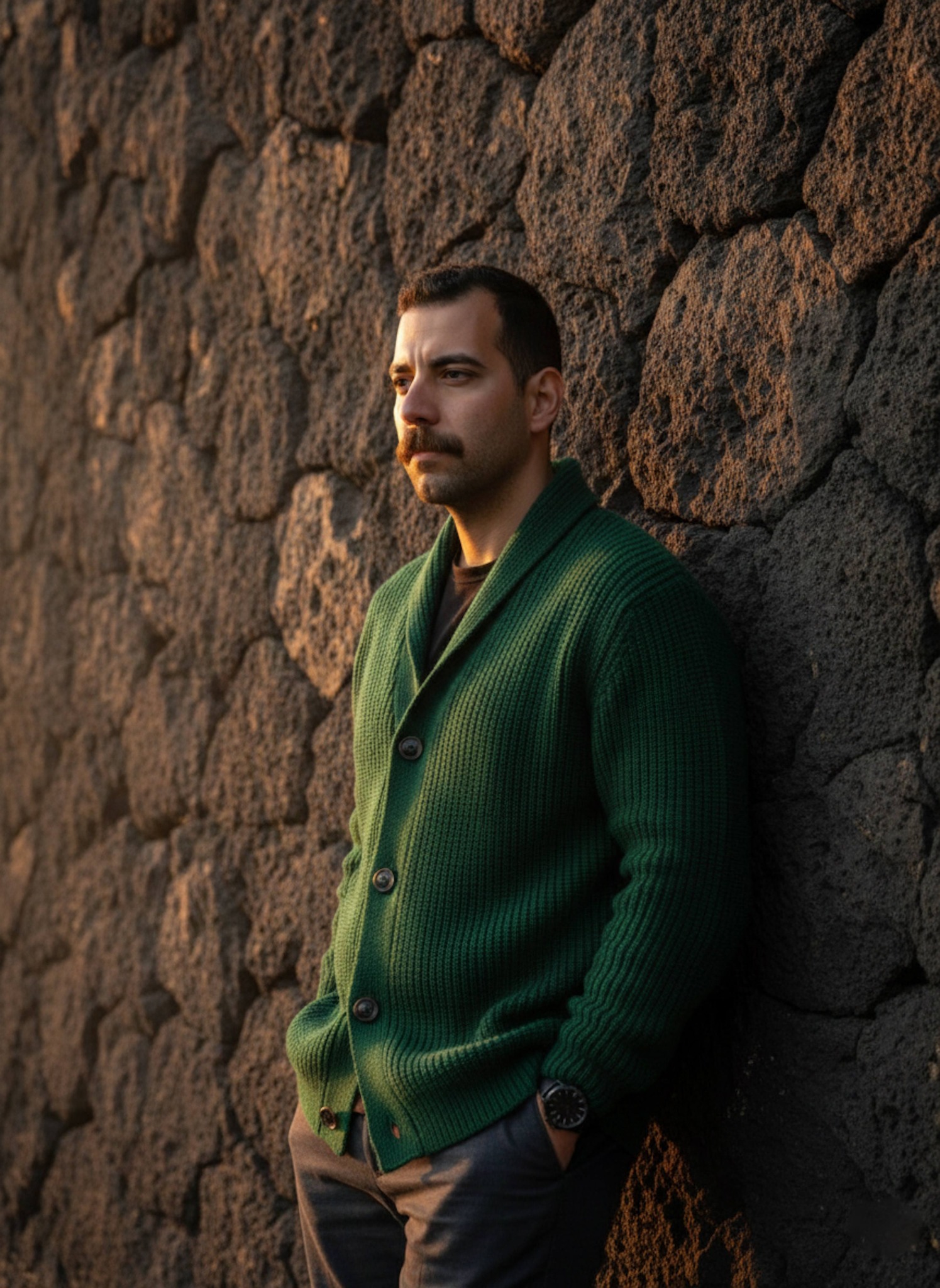 A dramatic portrait of you leaning against a massive volcanic stone wall, with strong side-lighting from a setting sun highlighting both the rugged texture and your profile. A heavy emerald green wool cardigan with wooden buttons adds warmth against the raw geology. Ideal for nature lovers, sunset photographers, and those seeking portraits with powerful textural contrast.