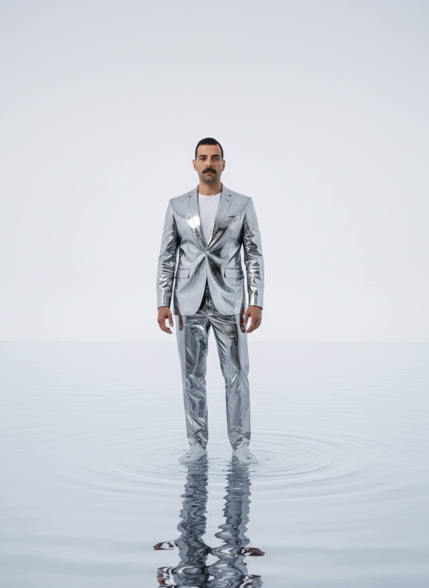 Stand on a perfectly still lake of liquid mercury in a horizon-less silver void wearing a suit of flowing reflective metal. This sci-fi effect creates a surreal, fluid atmosphere with 360-degree soft white light and perfect symmetry. Ideal for fans of minimalist, otherworldly portrait concepts.