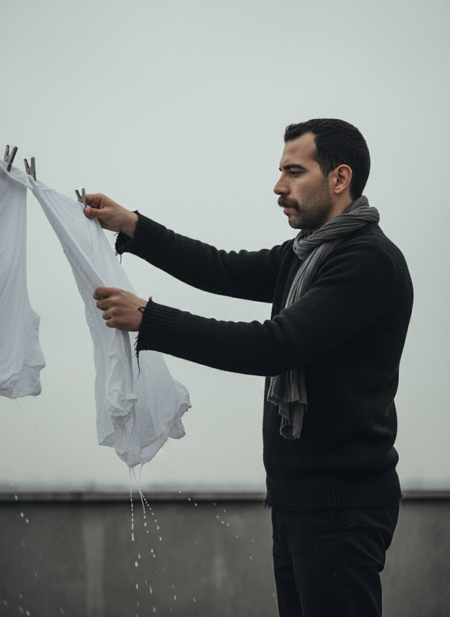 Brave the winter wind in this atmospheric rooftop laundry documentary portrait. You hang wet laundry on a high rooftop against the winter wind, cold light and overcast skies framing the urban skyline behind you. The silent documentary style captures the quiet routine and resilience of everyday rooftop life. Ideal for slice-of-life aesthetics, winter profiles, or an authentic and atmospheric social media presence.