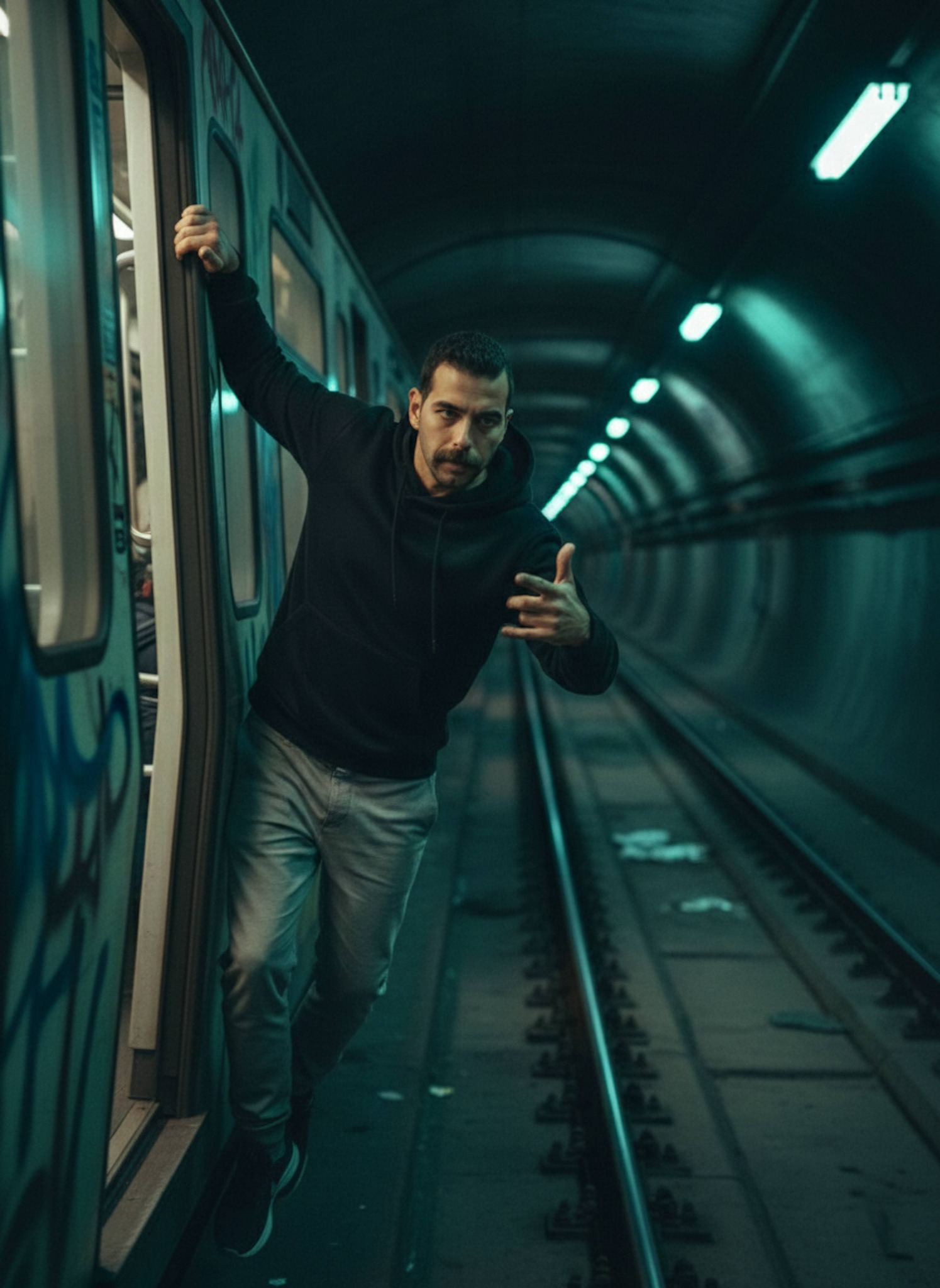 Live on the edge in this intense subway action portrait. You hang from a moving metro train in a black hoodie and grey track pants, one hand gripping the door frame with dramatic motion blur on the tracks behind. Cool teal and green tunnel lighting creates moody depth with gritty high-contrast street photography style. Ideal for urban culture profiles, action-packed content, or a bold and rebellious social media avatar.